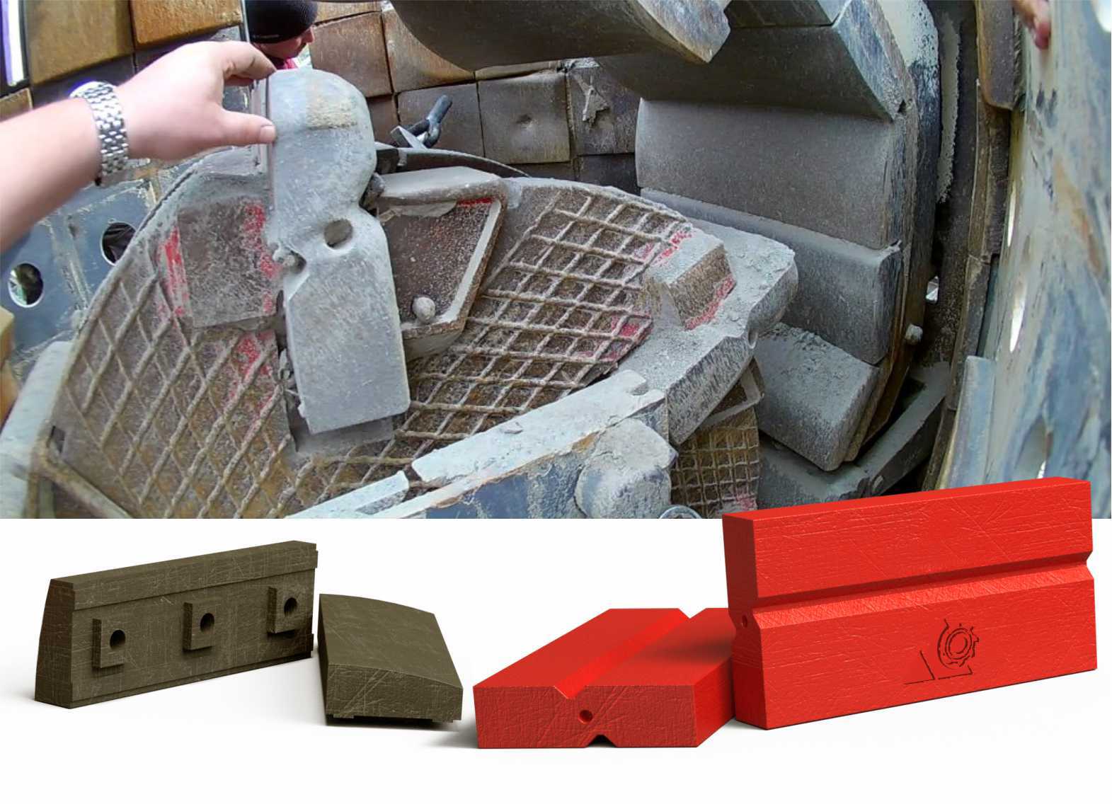 Взаимозаменяемые дробящие плиты из литья CrMo (Испания). Меняйте местами износившиеся и не изношенные плиты чтобы продлить срок их службы.